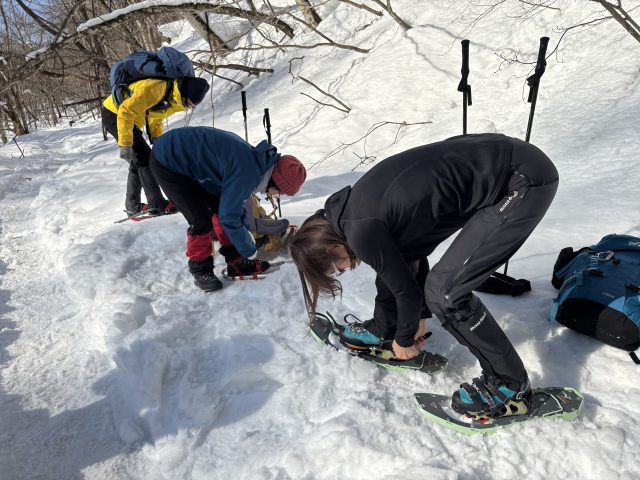 昨日に続いて裏磐梯エリアに位置する雄国山ツアーです。雄子沢渓谷登山口からスノーシュー装着して出発します。