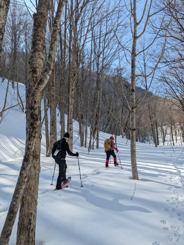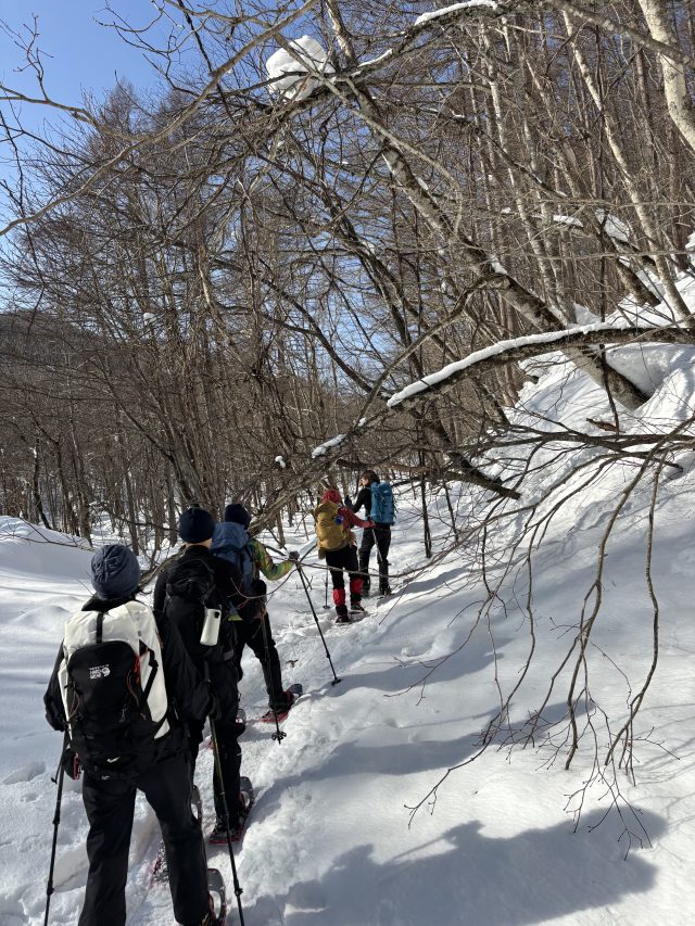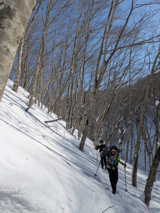 ここから急斜面のトラバースが始まります。スノーシューの歩き方をレクチャーされたので安定感のあります。ちょっと安心です。
