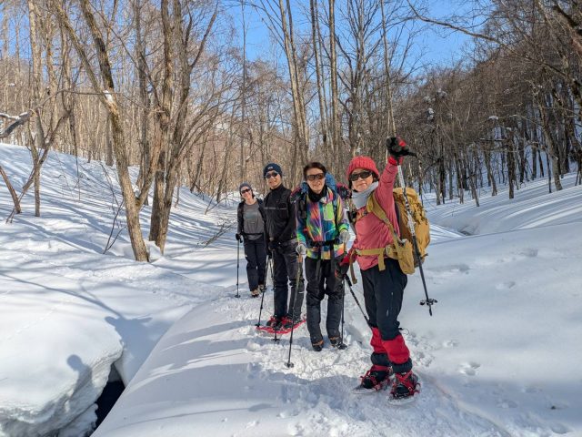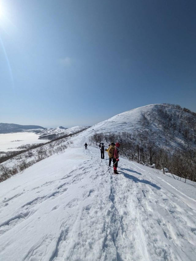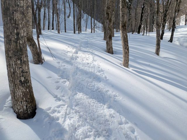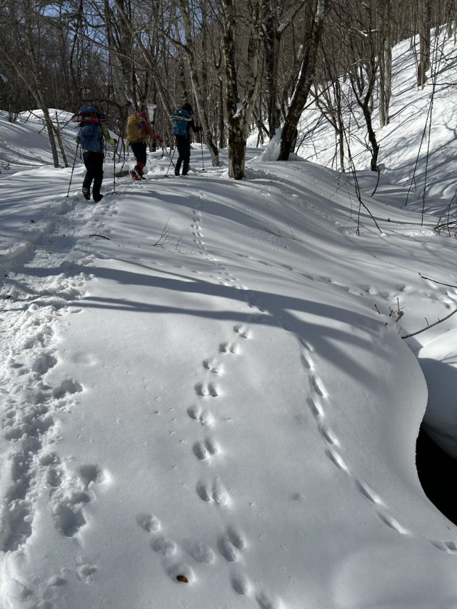 ここからは冬限定の稜線歩きをして一気に下るコースを行きます。名残惜しいですが出発点にまもなく着きます。小動物の足跡ををいながら楽しみましょう。今日はありがとうございました。