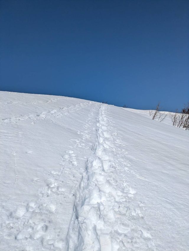 このところ低温が続いているので雪は締まっているようで途中まではツボ足です。