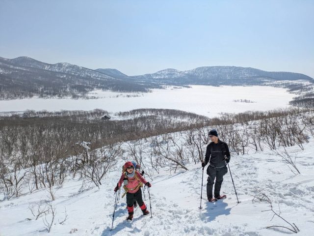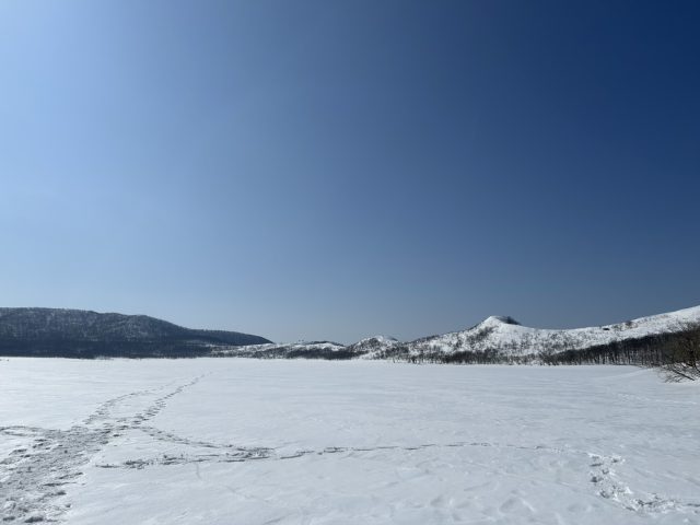 休憩舎の前方には凍結したカルデラ湖が広がっています。ちょうとだけ歩いてみませんか。