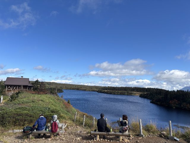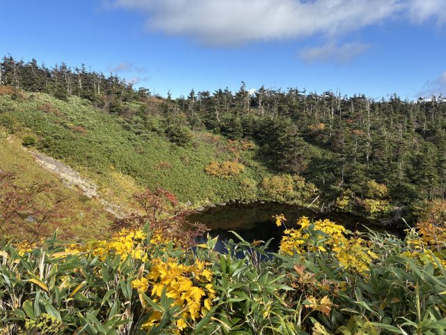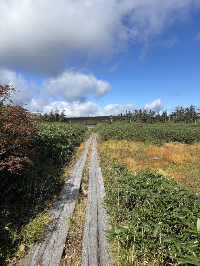 八幡平山頂直下、標高1541mの見返峠駐車場の一角に「八幡平パークサービスセンター」がある。岩手・秋田の県境で、八幡平アスピーテラインと八幡平樹海ラインが交差するこの場所は、八幡平周回トレックや裏岩手、遠くは県境を縦走しての秋田駒ヶ岳への登山基地でもある。お天気にも恵まれた初日は裏岩手連峰縦走の起点になる藤七温泉登山口の確認をしながら、オオシラビソの森に囲まれた、湿原、沼が点在する、お皿を伏せたような形のなだらかな山(山とは言いがたい)八幡平をゆっくりと2時間ほど歩く。