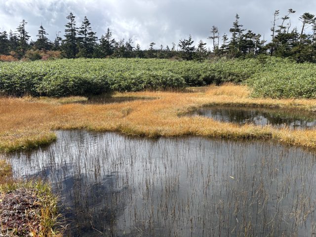 点在する池塘は高層湿原には欠かせないです。池塘(ちとう)って、火山噴出物の間にできた凹地に水が溜まり、土砂等により次第に浅く鳴り、水性植物が育つようになったのが始まりです。これらの植物の廃植質が水中に堆積して更に浅くなり、次第に水気を好む色々の植物が育つようになり、湿原となるようです。堆積物は酸素の少ない状態で腐るので、炭素分だけ残って泥炭層ができるのです。数百年も過ぎるころには石炭とかもね 笑。