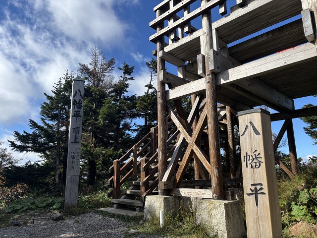 お待たせしました。ここが八幡平山頂になります。展望台からはオオシラビソの森に囲まれた広大な国立公園八幡平が望めます。遥か遠くには八甲田山山脈方面でしょうか。