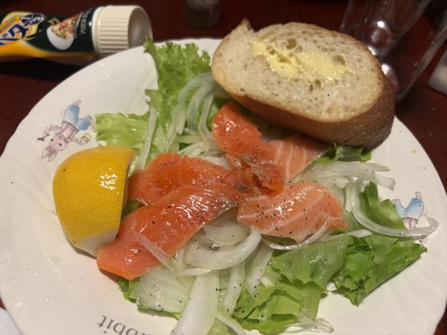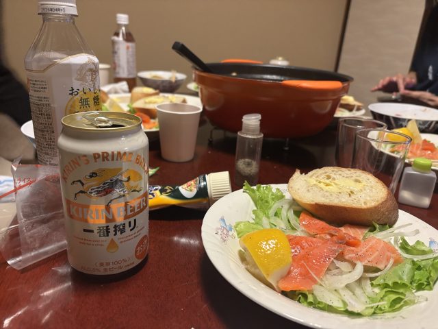 本日は洋風イメージで、前菜はカルパッチョに赤ワイン。そしてトマトソースをたつぷりの洋風チーズ鍋です。皆さんにお手伝い頂きながらできあがりました。