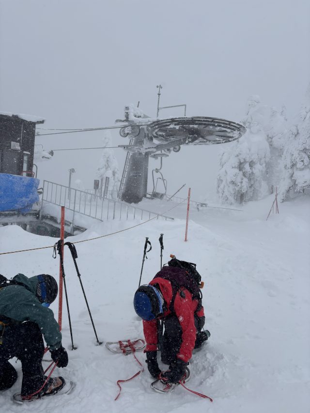 画像が飛びますが、かみのやま温泉宿で♨️三昧で過ごして、翌朝、蔵王連峰の登山口であるライザワールドスキー場に向かいました。旅館での気温はマイナス5度。さすが雪国だと思いながら道路も凍っていて寒かったですね。スキーヤーで賑わっているが館内は登山者装備をした人が少なくツアー参加者が数組くらいのようです。それでもリフトを乗り継いでトップゲレンデへ。この辺りは風は感じないが視界不良のようです。まず始めにスノーシューを装着しましょう。