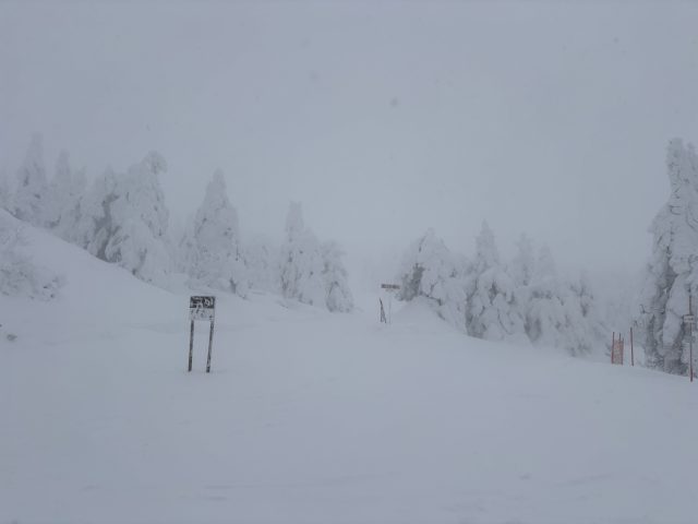 標高が上がってくると強風と寒さが襲ってくるようです。普段はあっという間に行けそうな避難小屋辺りで残念ながらタイムアップです。振り返ると安達太良山から朝日連峰までの展望を見てもらえなかったのが残念ですが、ここで撤退します。お疲れ様でした。この後、スキー場を下りましたが、強風と寒さがより厳しい天候となりました。