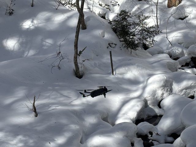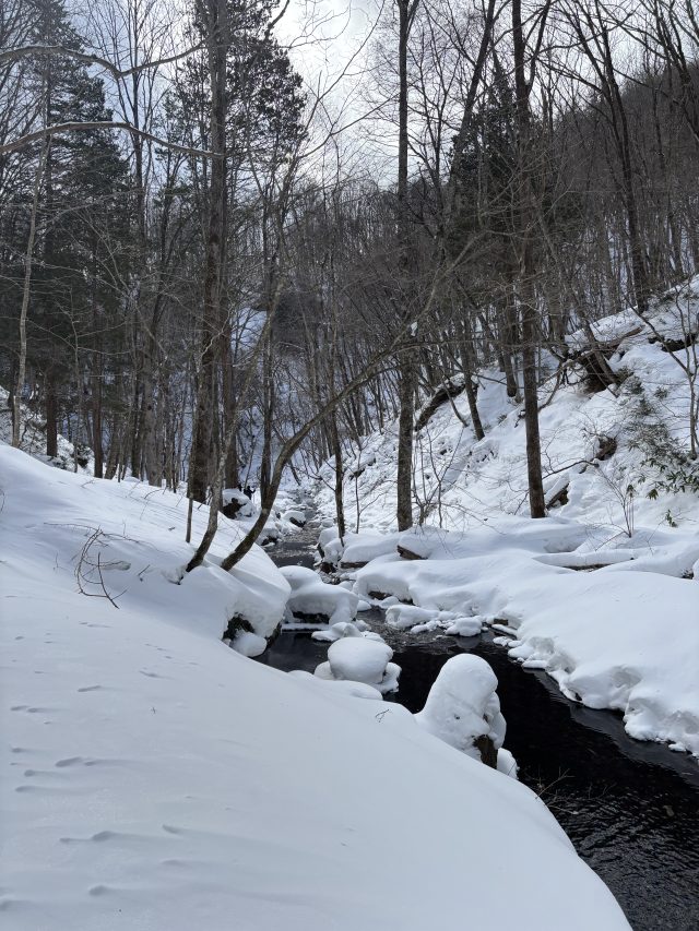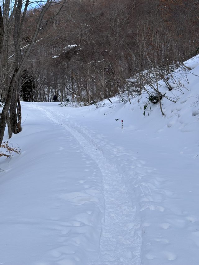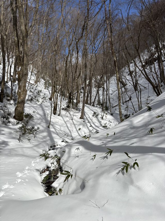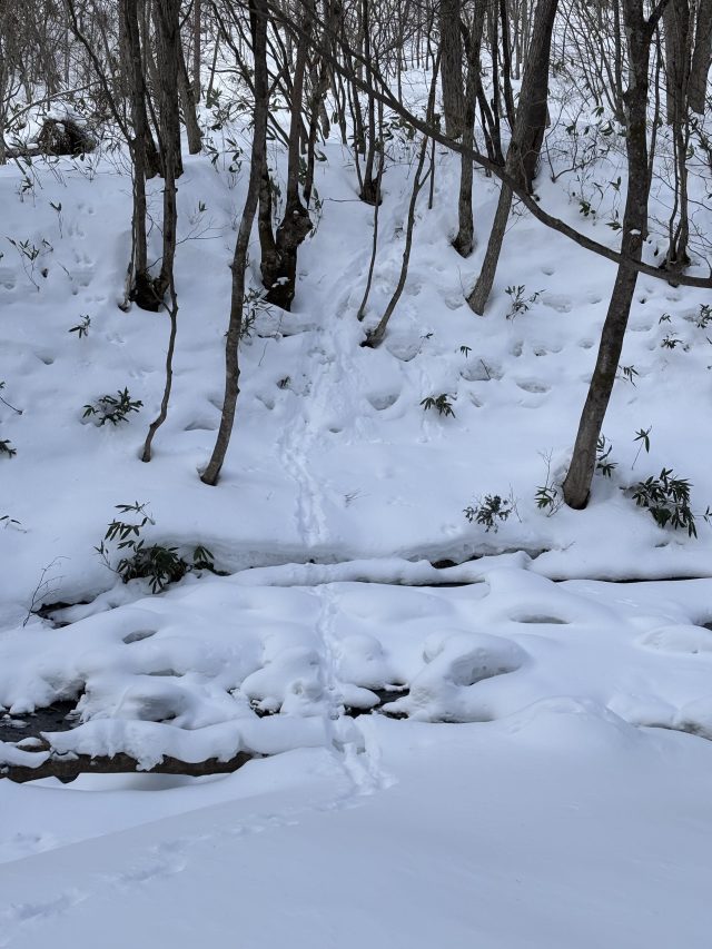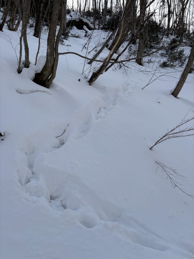 急斜面を下りて沢すじに走り去るカモシカの足跡が生々しいですね。