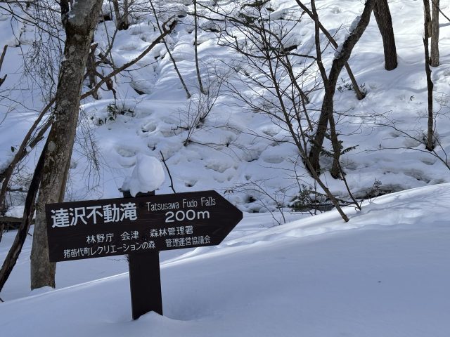 安達太良山系船明神山に源を持つ不動川にある滝です。中ノ沢温泉街から車で10分ぐらい林道に入ると冬場は誰も入らない達沢不動滝に続く原生林がある。ここから40分ぐらい歩くと達沢不動滝に到着する。「ふくしま緑の百景」に選ばれた原生林はミズナラを主体とした多数の植物で構成されており、センノキ・シナノキ・ミズキ・イタヤカエデ・アカマツ・トチノキ等の老古大樹が森林の自然形態をそのまま残っています。途中から達沢川に変わり猪苗代湖に流れ出る。冬場は訪れる人の少ない原生林に囲まれた信仰の地の名爆を求めてのスノーハイキングツアーです。