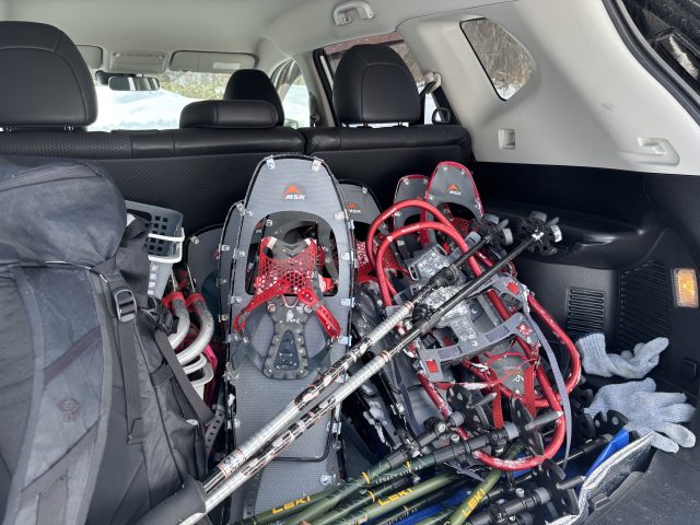 たくさんのスノーシューを積み込んで現地まで先導します。