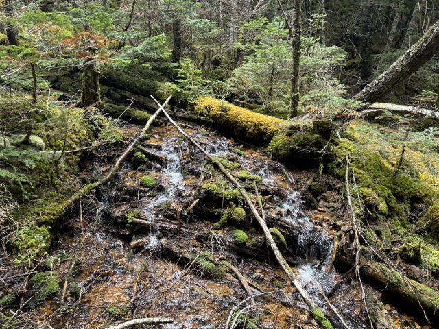 一気に急斜面を下り千曲川源流を辿りながら毛木平に戻ります。千曲川-信濃川水源地標がありました。水源の水流はわずかだが、ここから約370kmを旅して日本海の注ぐ大河となるだろう。